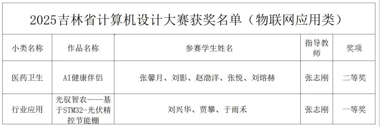 近日,2025年中国计算机设计大赛吉林省级赛事圆满落下帷幕。人工智能产业学院的学子们凭借扎实的专业知识、卓越的创新能力和不懈的努力,一路过关斩将,最终在大数据应用、物联网应用、人工智能应用以及微课与AI辅助教学、和软件应用与开发等领域获得佳绩,共获得了一等奖1项、二等奖9项、三等奖6项和优胜奖3项。