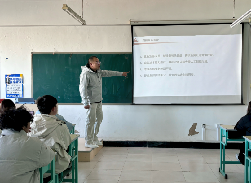 讲座伊始,韩老师以“当前企业现状”为切入点,结合科技发展趋势,分析了人工智能在医疗、金融、智能制造等领域的颠覆性应用。他指出,当前企业业务加速向智能化转型,传统岗位需求减少,而具备AI技术能力的复合型人才正成为行业“香饽饽”。通过数据与案例,韩老师强调:“AI不仅是工具,更是未来职业的核心竞争力”。随后,韩老师聚焦职业规划,提出“精而专”的发展路径。他提到,随着行业细分,学生需在掌握AI基础理论的同时,选择细分领域深入钻研,如计算机视觉、自然语言处理等,更好的提高自身专业素养。