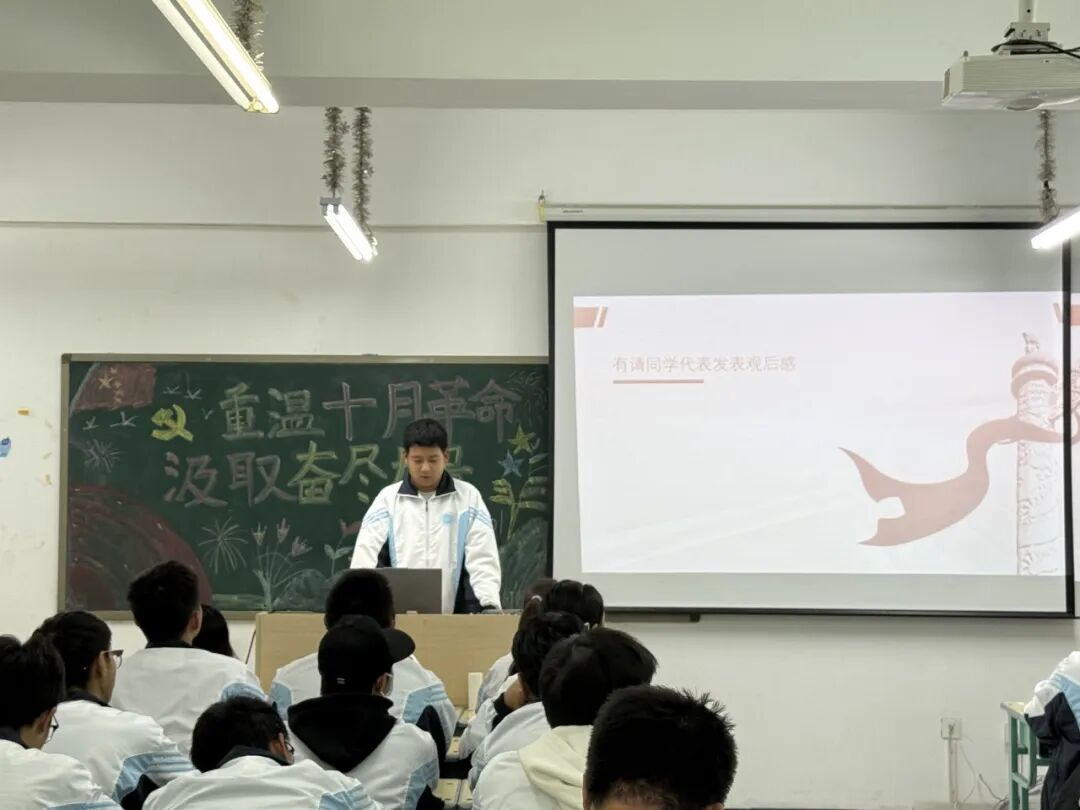 在理论学习后,各班集中观看了十月革命主题纪录片。屏幕上,革命者们冒着枪林弹雨冲锋的身影、苏维埃政权建立时的庄严时刻,将书本中抽象的历史转化为具象的感动。观影结束后,同学们纷纷表示,革命先驱的影像让他们对历史与今天血脉相连有了更深刻的体悟。大家一致认为,十月革命作为“红色源头”,其精神与中国共产党的成长历程紧密交织,只有读懂这段历史,才能倍加珍惜当下的幸福生活。