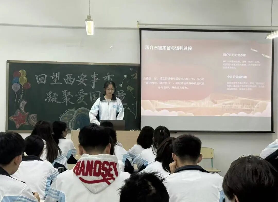 在活动进行中,各班观看了西安事变主题纪录片。屏幕上,历史场景重现,革命先辈们坚定的眼神、无畏的勇气以及为了民族利益而做出的英勇抉择,深深触动了每一位同学的心灵。观影结束后,同学们纷纷表示,这些珍贵的影像资料让他们对历史与现实的联系有了更加直观和深刻的认识,更加珍惜今天来之不易的和平与幸福。