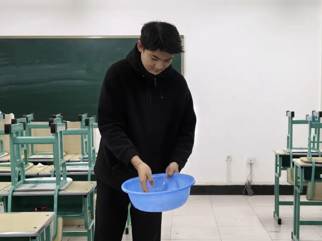 在活动筹备阶段,学生干部们通过班级群等渠道提前发布通知,提醒同学们整理好个人物品,避免消杀过程中造成损坏。同时,也对参与活动的同学们开展专项培训,围绕消毒粉配比、工具使用规范与操作流程进行详细讲解,为活动的顺利实施奠定基础。
